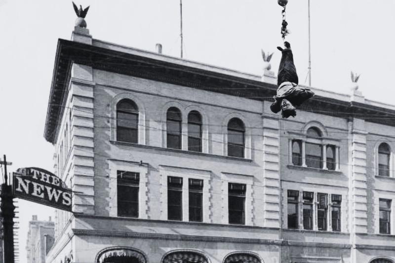 Houdini’s visit to Dallas was a spectacle that captured the imagination of thousands. On January 21, 1916, Houdini treated the people of Dallas to an extraordinary sight. Picture this scene: a crowd of 10,000 Texans packed the block in front of The Morning News building. They were there to witness Houdini perform one of his most daring feats—escaping from a straitjacket while suspended upside down, three stories above the street!